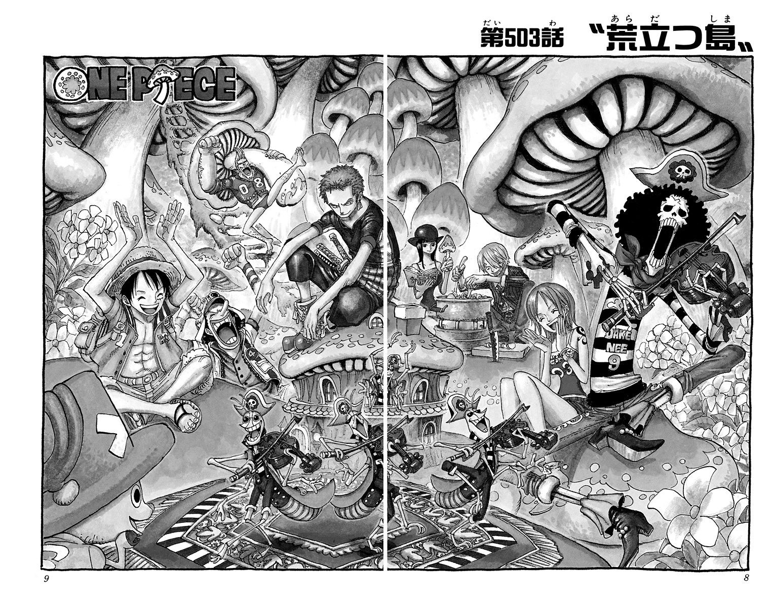 Color Spread: The Straw Hats are partying in a mushroom world. Brook plays viloin along with a band of pirate grasshoppers as they all wear matching outfits.