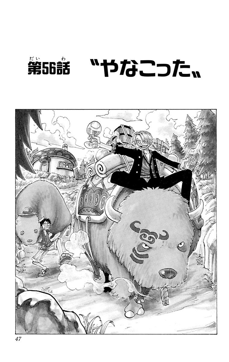 Animal Theater: Sanji heads out on a cigar-smoking bison, packed with several days' provisions; Luffy follows behind, for some reason carrying his own bison (who is also wearing his hat) instead of riding.
