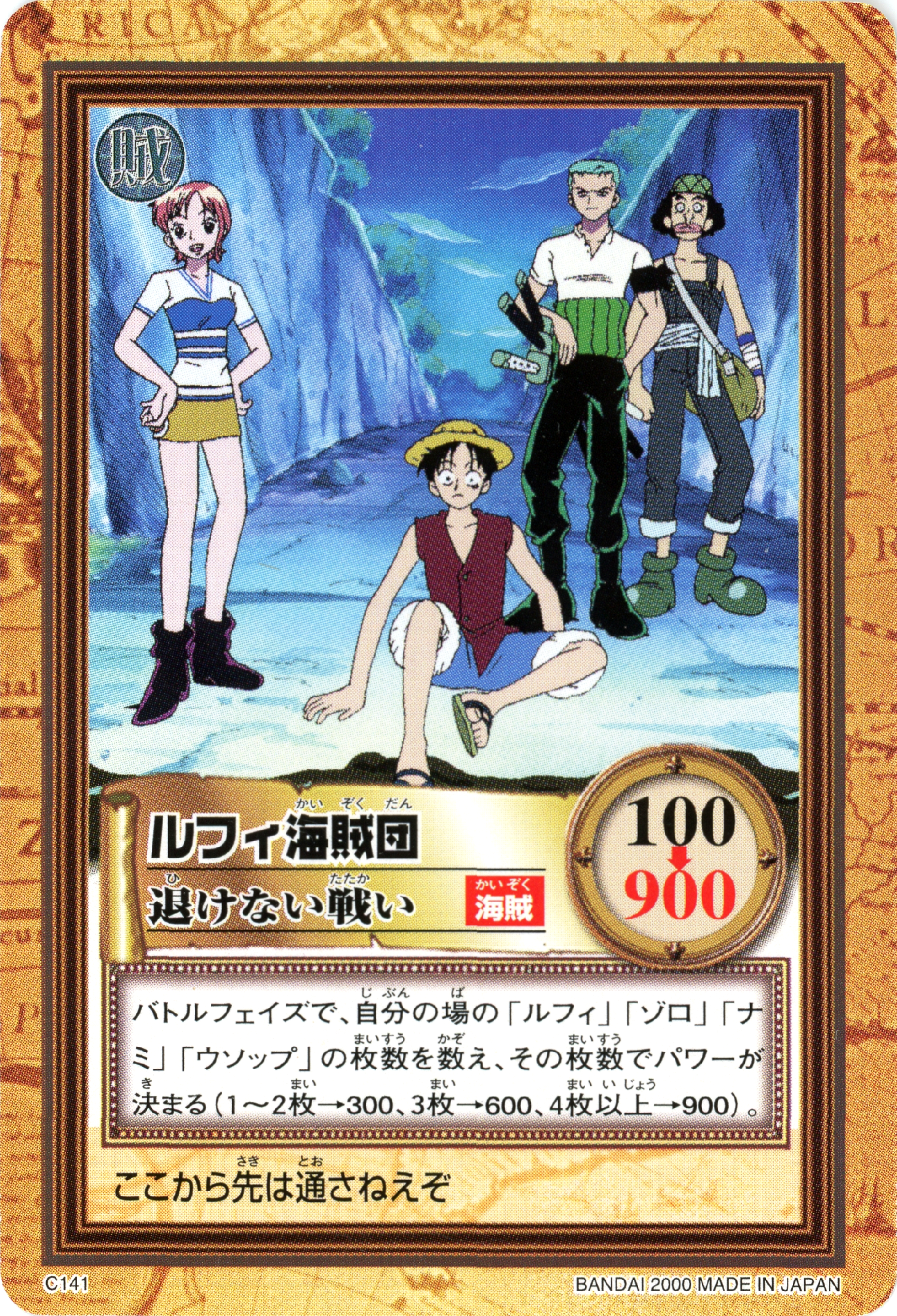 | バトルフェイズで、自分の場の「ルフィ」「ゾロ」「ナミ」「ウソップ」の枚数を数え、その枚数でパワーが決まる(1~2枚→300、3枚→600、4枚以上→900)。 |